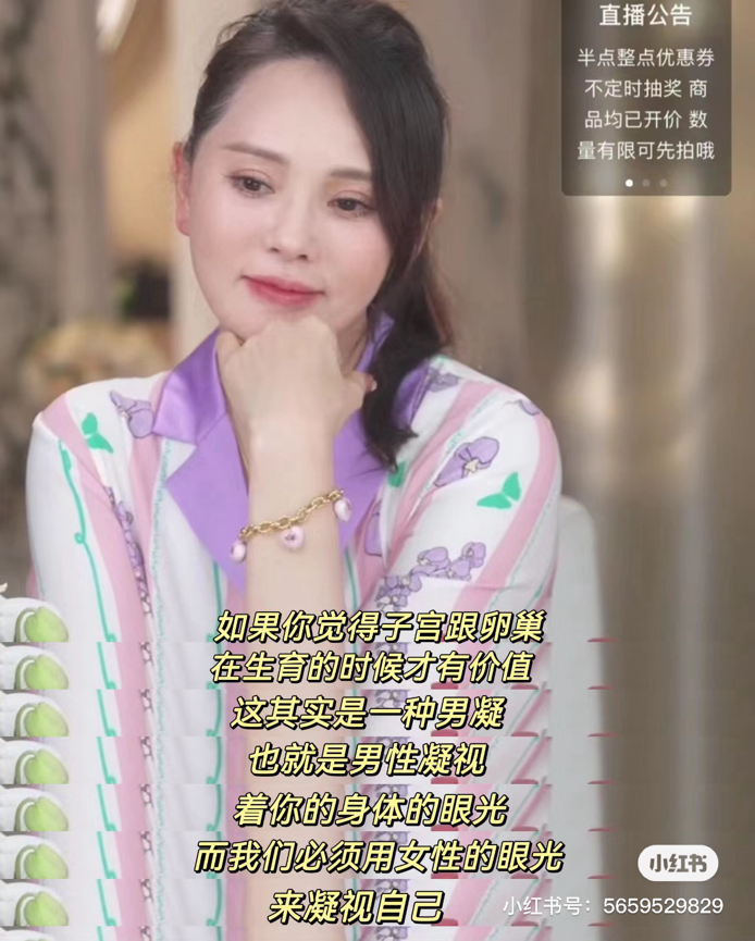 直播中除了产品外,输出的女性悦己的观点,成为伊能静的必杀技。“如果你觉得子宫跟卵巢在生育的时候才有价值,这其实也是一种男性凝视,而我们必须用女性的眼光来凝视自己。”“我觉得有钱不是要让别人看得起我或者乱花,因为不是世间所有东西都值得买,有钱真正的意义反而是让你知道你有钱可以选择,你要想象当你财富丰盛的时候是你有选择的能力,我为了这个选择的能力希望达到财富丰盛的结果。”