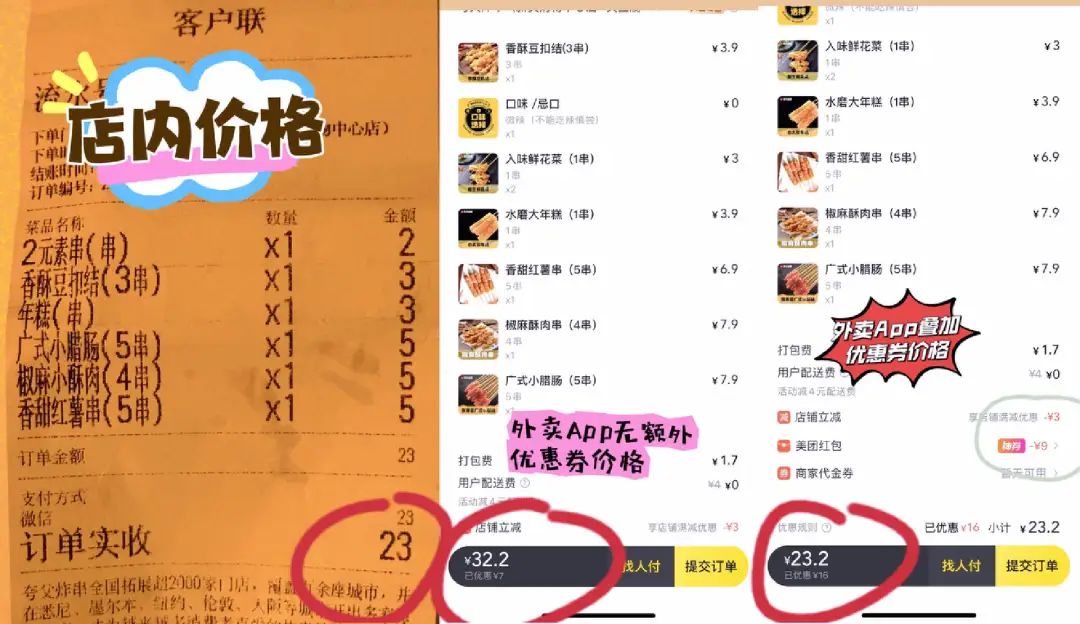 我特意对比了一下,那家炸串店,当天我在店里购买的商品实付价23元,如果通过外卖平台应收价格在32.2元,如果叠加我到处搜罗的优惠券,优惠后价格是23.2元。虽然叠加优惠后价格差异不大,但每个人手中优惠券的情况是不同的。