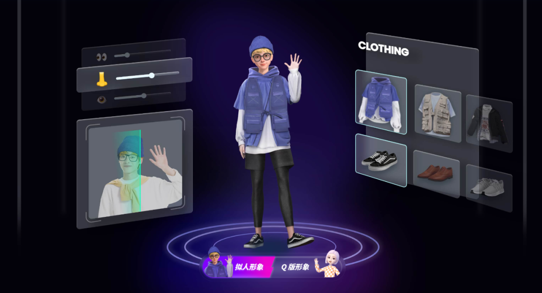 以即构虚拟人Avatar为例,企业可选择拟人形象和Q版形象,并可以在线直接体验给虚拟人换装、捏脸,并通过AI完成了表情驱动、声音驱动、文本驱动、肢体驱动等全方位的驱动方式。