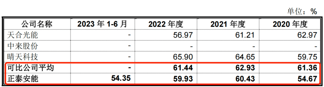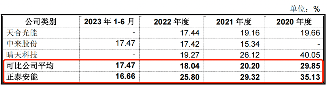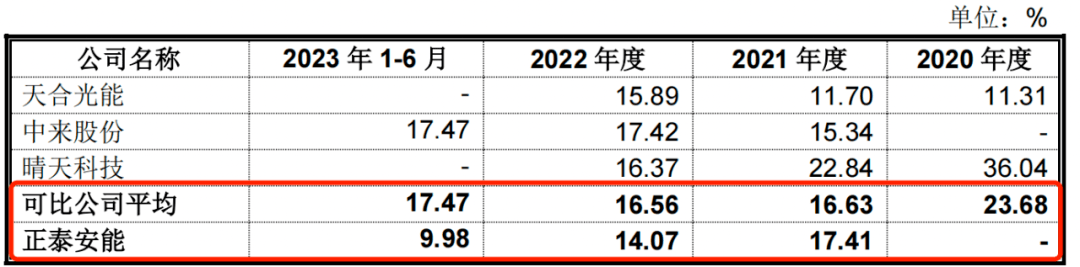 报告期内,正泰安能户用光伏电站合作共建业务毛利率分别为54.67%、60.43%、59.93%、54.35%;2020年-2022年(同行可比公司2023年上半年并未披露),同行可比公司毛利率平均值分别为61.36%、62.93%、61.44%。2020年-2022年,户用光伏电站合作共建业务毛利率均低于同行可比公司。