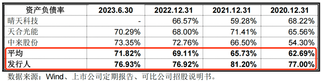 招股书显示,报告期各期末,正泰安能的资产负债率(合并)分别为77%、81.20%、76.92%和76.93%,资产负债率较高,且连年超出70%。