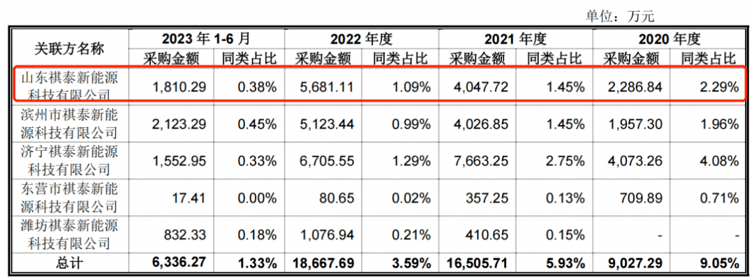 报告期内,公司向山东祺泰新能源采购金额分别为2286.84万元、4047.72万元、5681.11万元、1810.29万元。