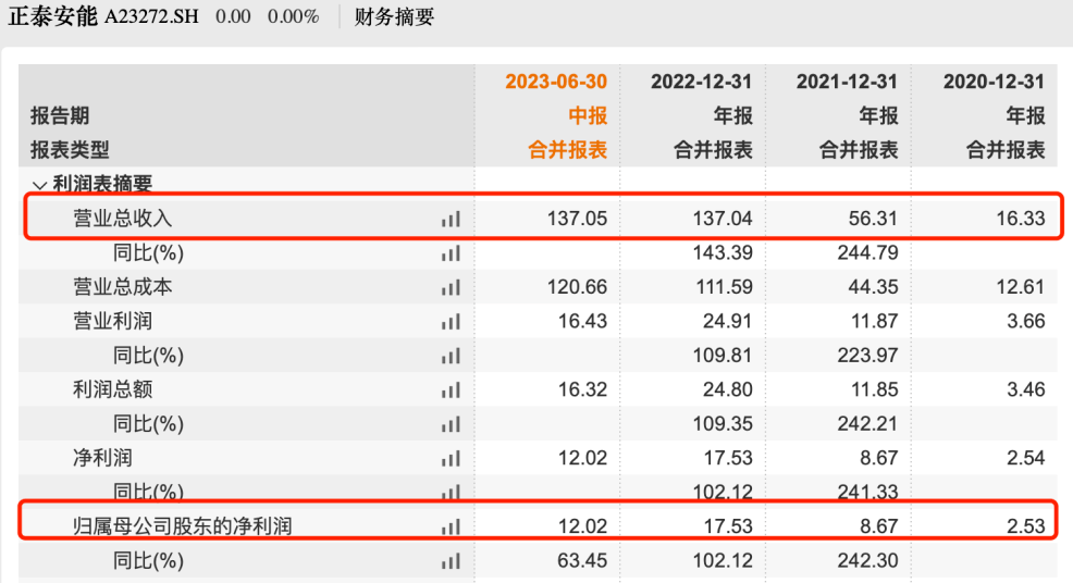 招股书显示,2020年-2023年上半年(以下简称“报告期”),正泰安能的营业收入分别为16.33亿元、56.31亿元、137.04亿元、137.05亿元;同期归母净利润分别为2.53亿元、8.67亿元、17.53亿元、12.02亿元。2020年-2022年,公司的营收和利润双双大幅增长,且2023年仅上半年营收就已经超过2022年全年。