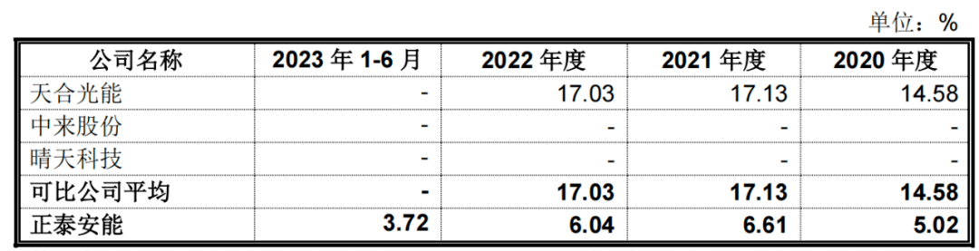 而正泰安能户用光伏系统设备销售业务毛利率,更是大大低于同行可比公司。报告期内,该业务毛利率分别为5.02%、6.61%、6.04%、3.72%;2020年-2022年(同行可比公司2023年上半年并未披露),同行可比公司毛利率均值分别为14.58%、17.13%、17.03%。