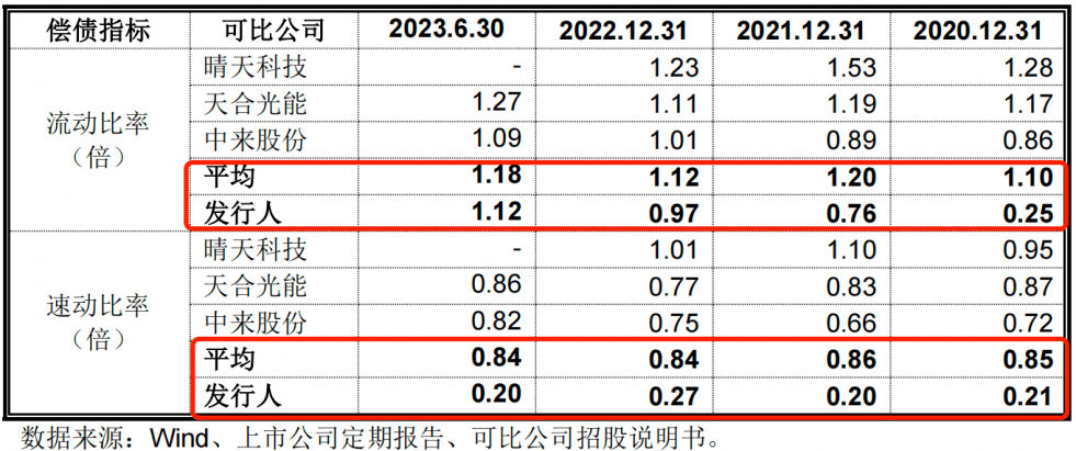 报告期内,公司的流动比率(流动资产对流动负债的比率)分别为0.25倍、0.76倍、0.97倍、1.12倍,同期同行可比公司的流动比率平均值分别为1.10倍、1.20倍、1.12倍、1.18倍。