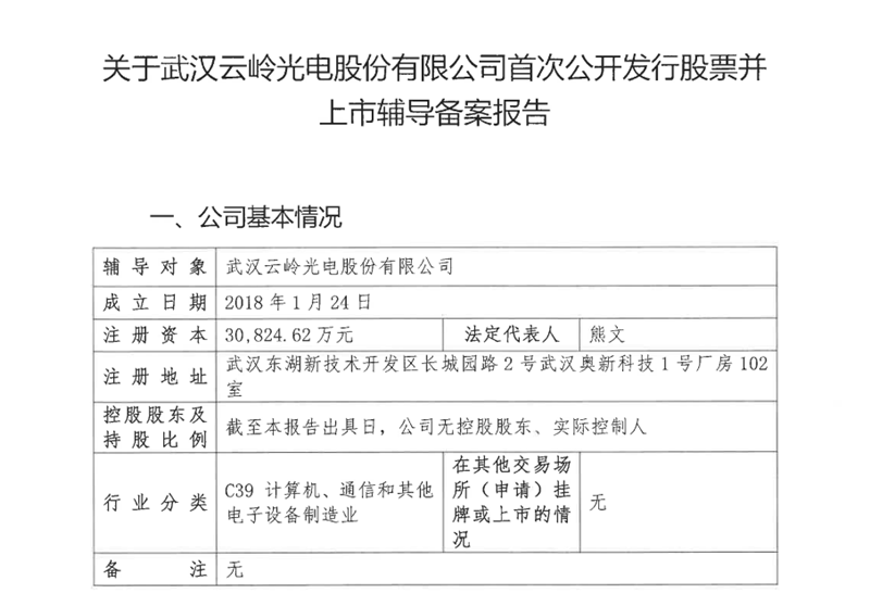 近日,证监会披露了关于武汉云岭光电股份有限公司,首次公开发行股票并上市辅导备案报告。根据报告显示,9月21日,云岭光电与海通证券签署了上市辅导协议。