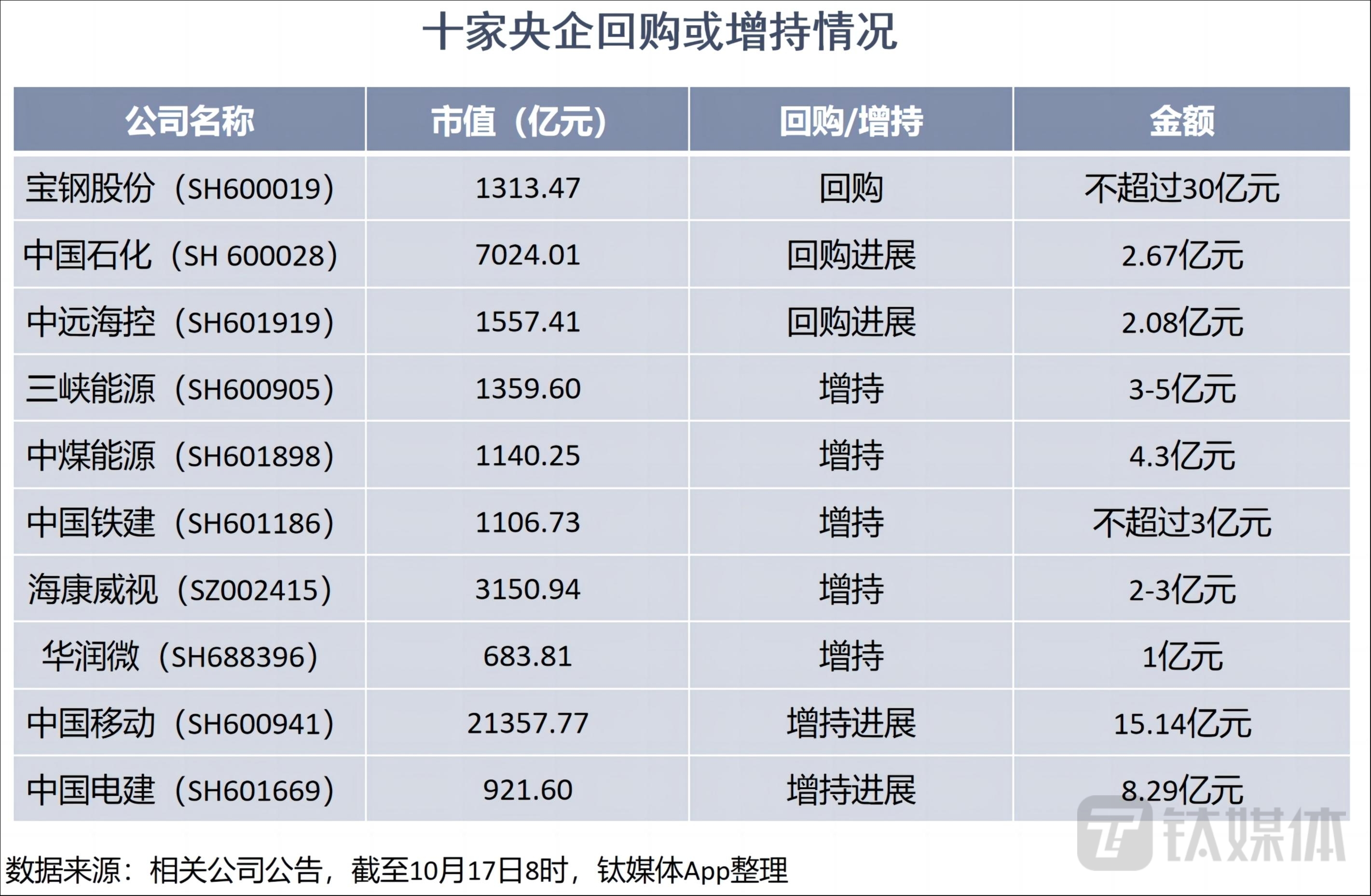 十家央企龙头上市公司接连发布公告,披露自身回购、增持计划或进展。按当日收盘价计算,这十家央企市值合计3.97万亿元,增持回购涉及资金约在60-80亿元之间,可谓大手笔,这套“组合拳”也形成了集聚效应,引发市场高度关注。