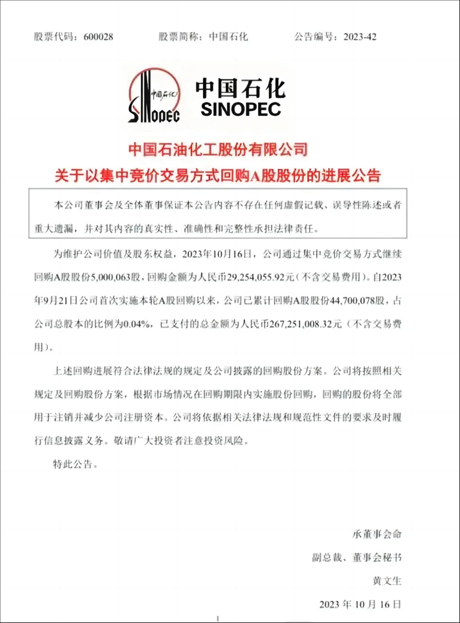 中国石化(SH 600028)公告称,公司通过集中竞价交易方式继续回购A股股份5,000,063股,回购金额为人民币29,254,055.92元(不含交易费用)。自2023年9月21日公司首次实施本轮A股回购以来,公司已累计回购A股股份44,700,078股,占公司总股本的比例为0.04%,已支付的总金额为人民币267,251,008.32元(不含交易费用)。