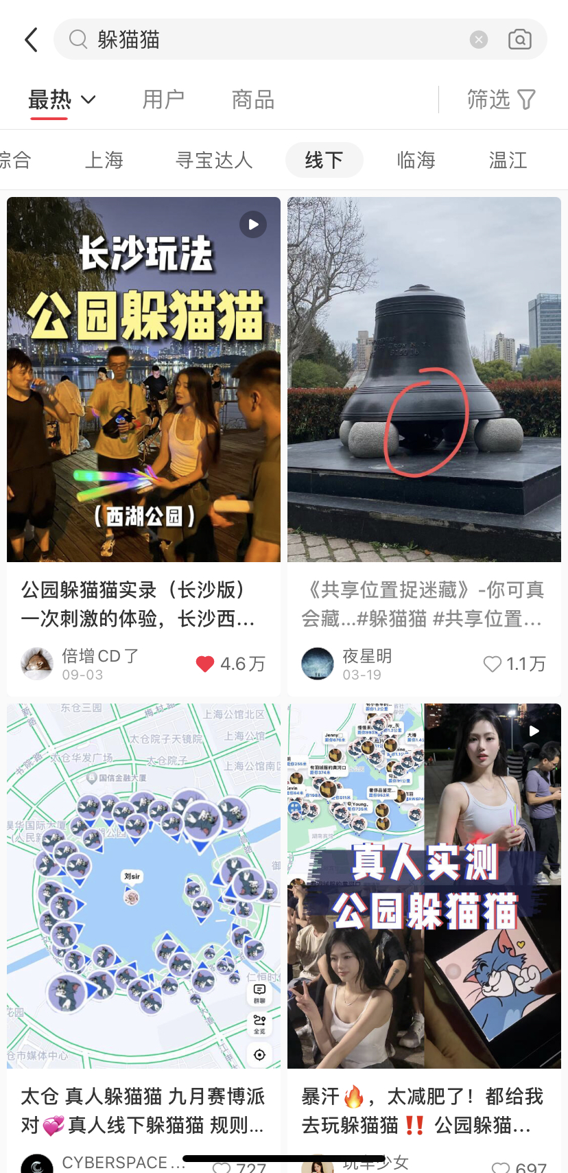小红书是第二轮发酵的主力军。由于其擅长发现和放大生活潮流趋势,就像挖掘飞盘、腰旗、橄榄球等新鲜玩法一样,官方也注意到了躲猫猫在年轻人群体中影响力扩大的趋势,在搜索界面中设置了线下、游戏、上海等标签。