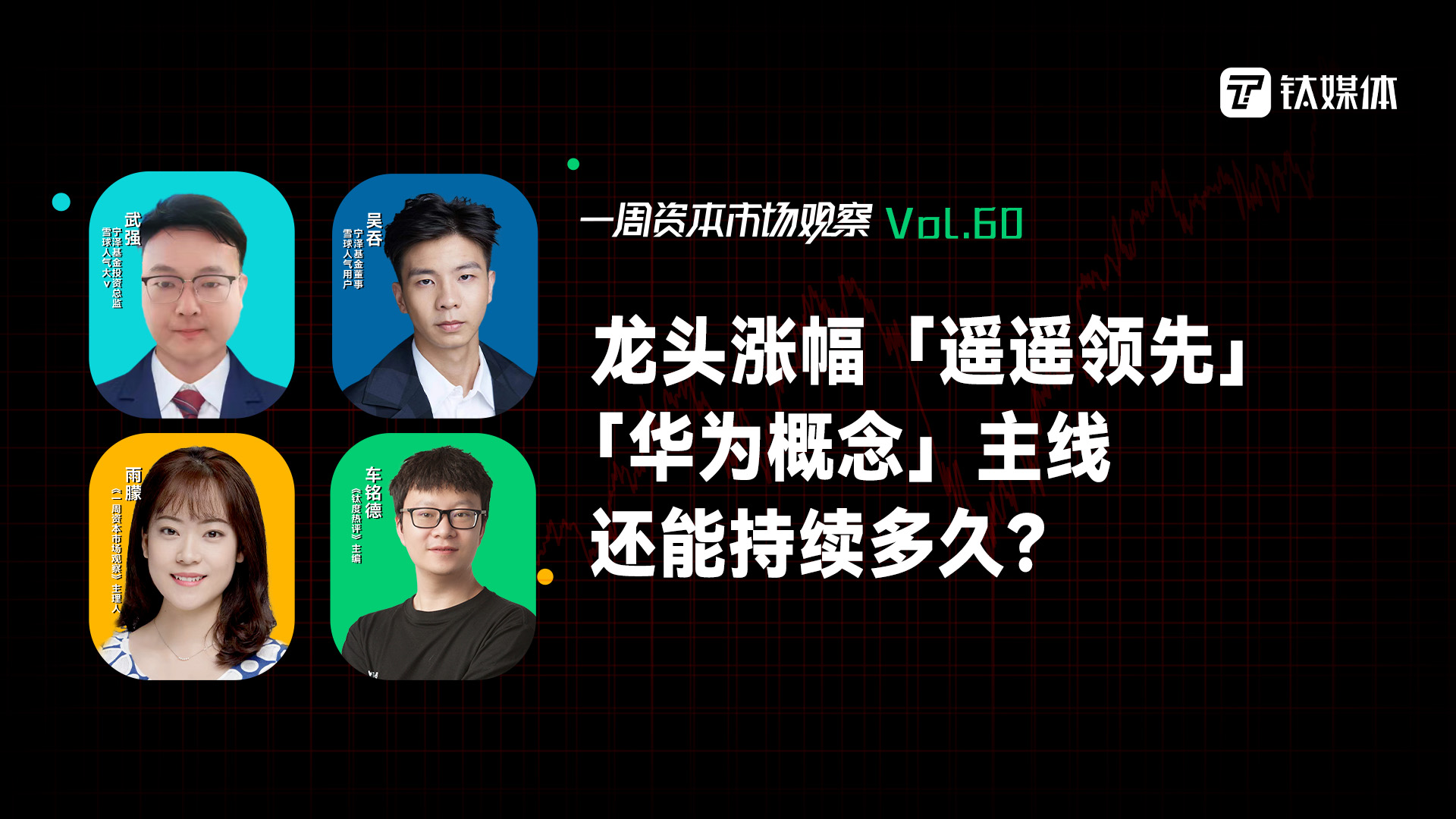本期节目,《一周资本市场观察》主理人雨朦特邀宁泽基金投资总监、雪球人气大V武强,宁泽基金董事、雪球人气用户吴吞,《钛度热评》主编车铭德,对近期A股市场的情况及热点板块进行了观点分享,并就近期资本市场关注度十分高的华为概念、TCL中环低价转让硅料子公司等事件进行了探讨。
