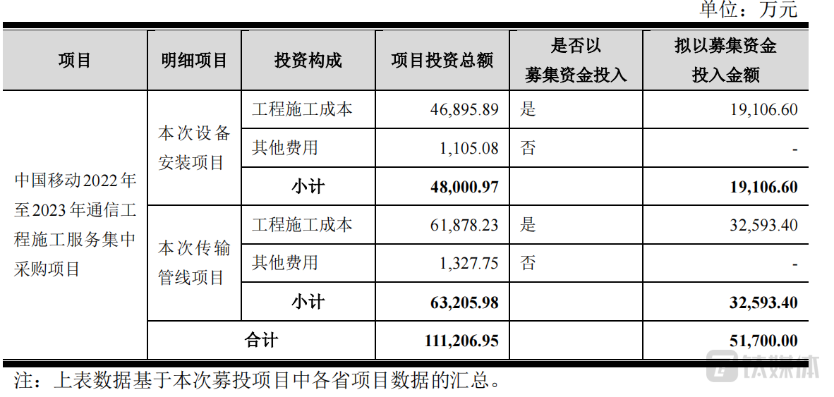 公告显示,公司发行可转债募集资金净额将全部用于“中国移动2022年至2023年通信工程施工服务集中采购项目”,该项目预计投资额11.12亿元,包括设备安装与传输管线两类工程。