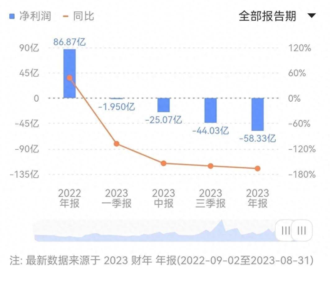2022年9月2日至2023年8月31日,美光科技的营业收入为155.4亿美元,同比下降49.48%;净利润为-58.33亿美元,而去年同期为盈利86.87亿美元。
