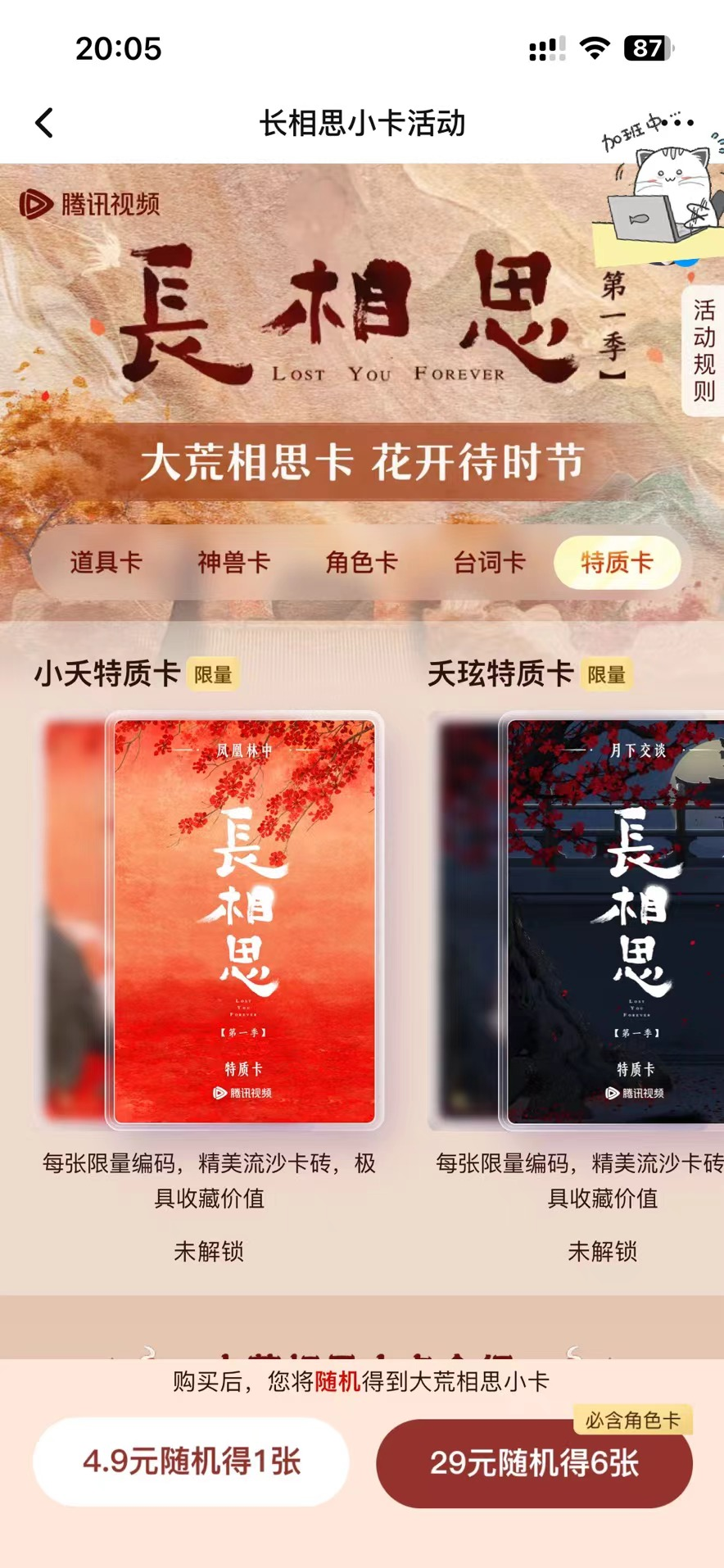 在玩法上,《长相思》则为线上线下用户定制了不同玩法,比如线下的后台直击、现场互动,线上的凤凰花、九尾狐吊坠、药草香囊等道具则可用于直播间发电。除此之外,和演唱会一起发布的“长相思小卡”也吸引许多人的注意,小红书上有人表示4.9元一张的小卡,自己氪金千元只为抽到喜欢的角色卡。
