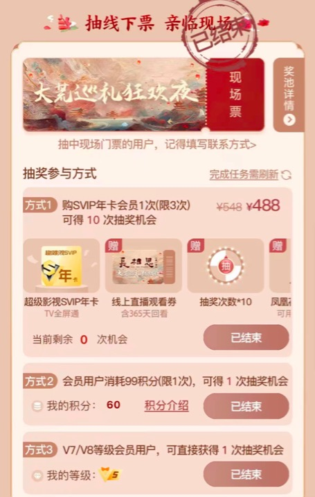虽然名曰“收官庆典”,但这本质上仍然是一场剧集售后演唱会,而粉丝肉眼可见的热情下,爆剧演唱会仍然是门好做的生意。据悉,本次庆典会员可以30元购买线上观看券,线下门票则需要通过充值腾讯视频SVIP年卡、消耗积分等方式获得抽奖机会。