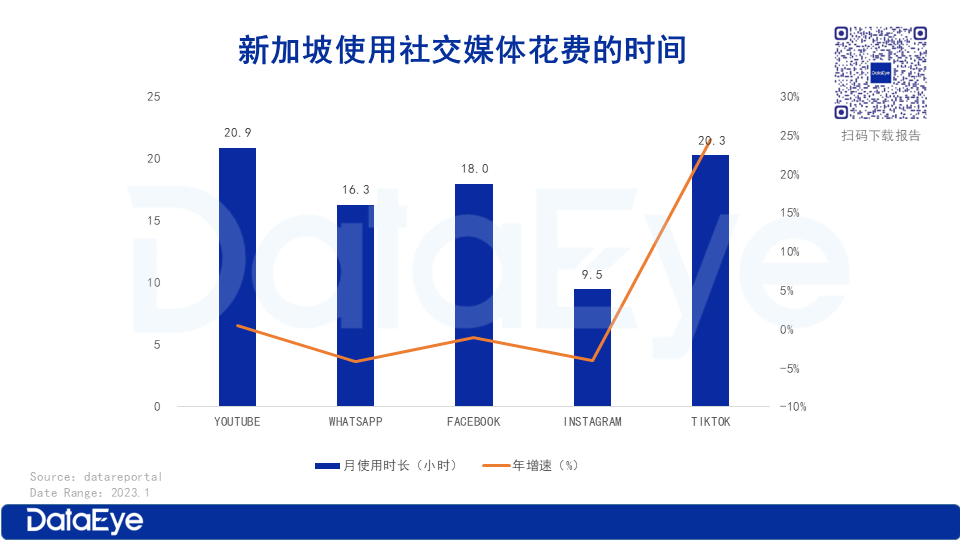 在新加坡人使用的社媒平台中,YOUTUBE占用的时间最长,Andriod用户每月平均使用该应用达20.9小时,TIKTOK排第二,用户每月要花20.3小时 , FACEBOOK第三,用户每月要花18小时。
