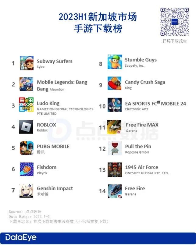 欧美大DAU游戏在新加坡下载情况较好,下载榜TOP10独占6席。