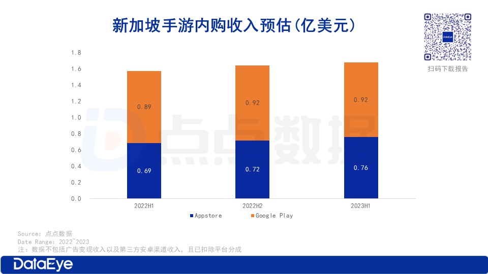 2023上半年,新加坡手游市场内购总收入达1.68亿美元,同比提升6%;总下载量达0.44亿次,同比增长13%。