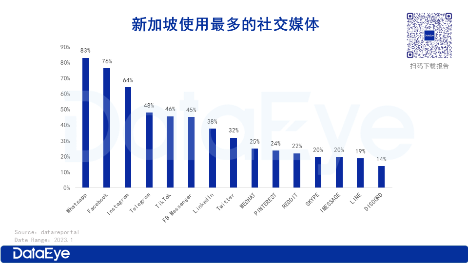 FaceBook系产品在新加坡互联网用户中占有重要的市场份额。Whatsapp、FaceBook、Instagram 包揽前三,约65-80%的用户经常使用这些平台,FB Messenger位居第七。
