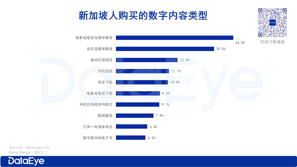 新加坡人购买的数字内容类型中,电影或电视流媒体服务、音乐流媒体服务和移动应用程序居前三,上述三项内容分别同比变动+1.2%、-12.0%、-9.8%。