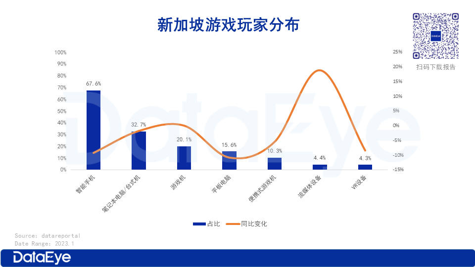 新加坡81.7%的网民玩游戏,手游玩家规模约318万人。在新加坡总人口中,581万人可以上网,约占 96.9%。81.7%的新加坡网民都在玩网络游戏,67%在手机上玩,该比例同比下降9.3%,即2023年新加坡手游用户约318万。