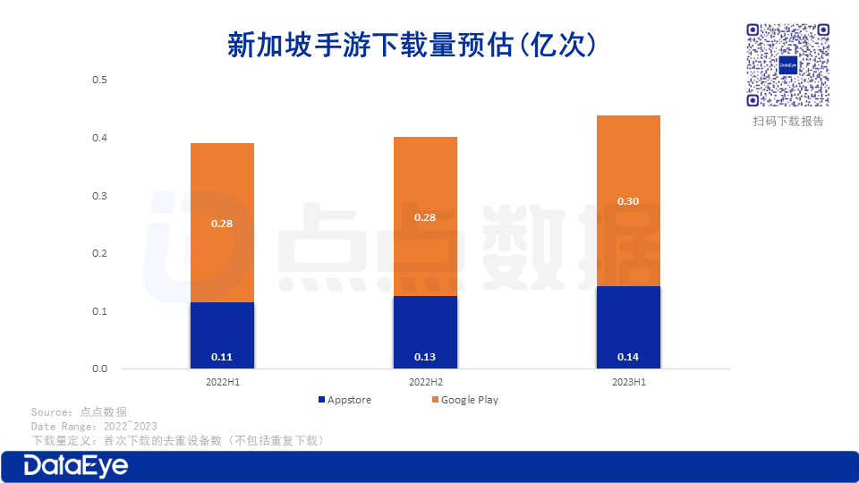 下载量升至0.44亿次,苹果端增幅较大。2023上半年新加坡手游市场总下载量达0.44亿次,同比增长约13%。