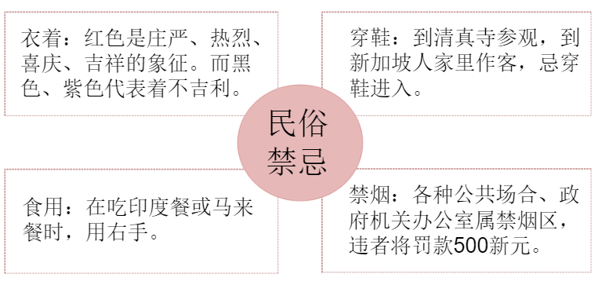 2、宗教元素:新加坡禁止在商品包装上使用如来佛的图像,也不准使用宗教用语。喜欢大象、蝙蝠图案,忌讳猪、乌龟的图案。