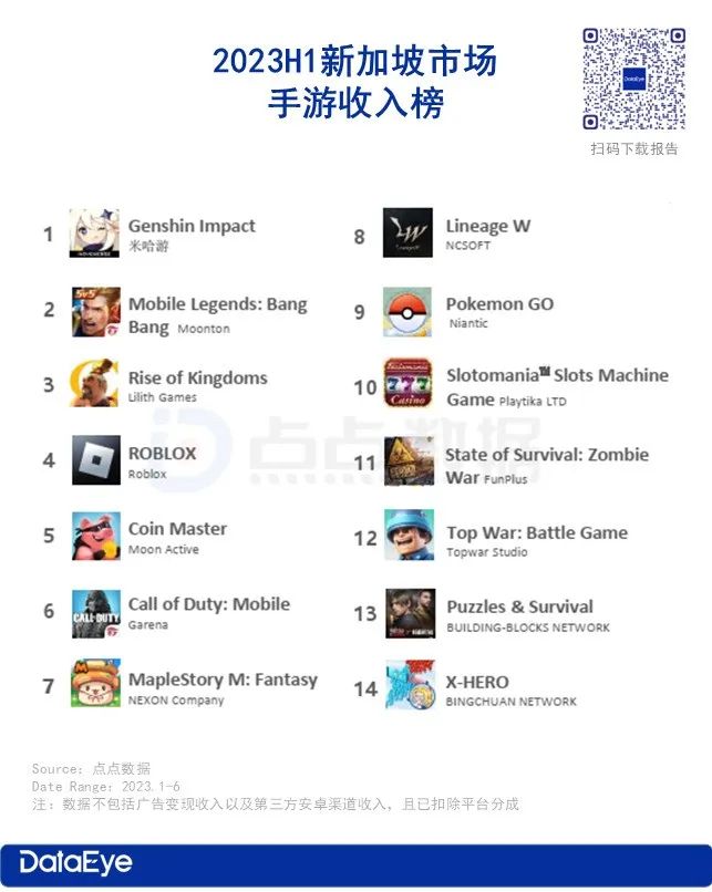 中国厂商米哈游发行的《原神》是新加坡23H1收入最高的游戏。