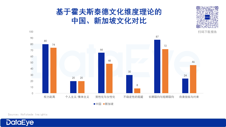 DataEye研究院根据荷兰心理学家——霍夫斯泰德文化维度理论,对比中国、新加坡文化差异。