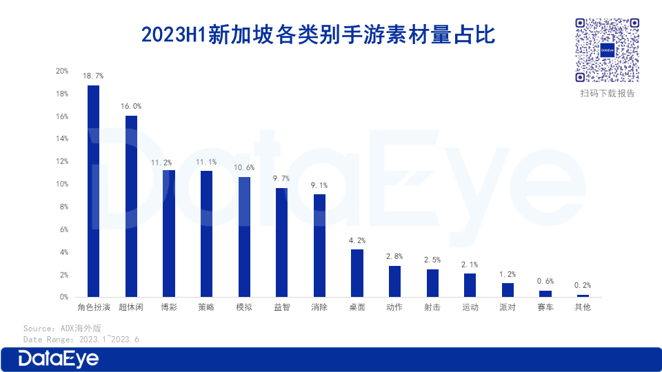 2023 H1新加坡投放素材量最高的游戏类型为角色扮演游戏,其次为超休闲和博彩游戏。Top3游戏类型素材占比新加坡素材总量约46%。