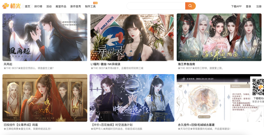 基于这种互动性,在橙光上的故事几乎都是恋爱向的,同时,鉴于国内男性群体有大量galgame(美少女游戏)可玩,橙光上的内容自然而然走向了乙女的定位,颇有晋江游戏版的意味。目前,橙光上的内容包含古风、现代、次元宇宙、快穿穿书等多个内容分区,每个分区下也有多个类别,便于用户快速找到感兴趣的内容。