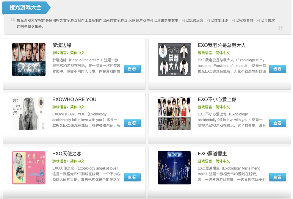 与此同时,2013-2018年期间处在搜索高峰期,或许也于平台上开始出现真人内容有关。2013年韩国偶像男团的热潮吹到中国,橙光游戏里出现了《遇见EXO》《EXO助理》等游戏,吸引了大量偶像粉丝走进平台,通过游戏形式体验完全不同的追星体验,这也激发橙光在后来划分出了“真人区”(现名为“明星区”),粘上一点偶像经济的红利。