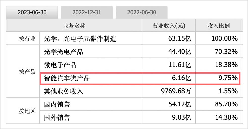 别忘了,早在2015年的低谷期,蔡荣军还抢先涉足车联网领域,次年募资13.7亿元,加强车用镜头的研发,抢滩汽车智能化业务。今年上半年,智能汽车类产品贡献收入6.16亿元,占比接近10%。