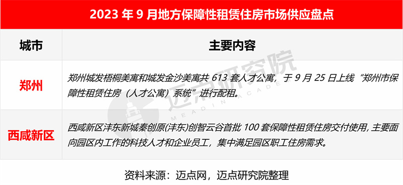 9月,保障性租赁住房筹集方面,住房城乡建设部表示,今年全国筹集建设保障性租赁住房204万套(间)的任务目前已完成72%,各地筹集建设进度不断加快,其中,上海、福州、宁波分别完成年度目标任务的83%、79%、81.2%。此外,南京建邺区人才集团新城人才公寓项目取得保障性租赁住房项目认定书,预计提供230多套房源。保障性租赁住房市场供应方面,郑州城发梧桐美寓300套房源和城发金沙美寓313套人才公寓,于9月25日上线“郑州市保障性租赁住房(人才公寓)系统”进行配租;西咸新区沣东新城先进制造产业园板块秦创原(沣东)创智云谷首批100套保障性租赁住房交付使用,进一步提升人才服务水平。