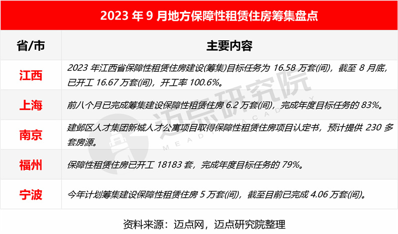 1、保障性租赁住房供应:上海、福州、宁波等地筹集进度约80%,美寓超600套房源在线配租