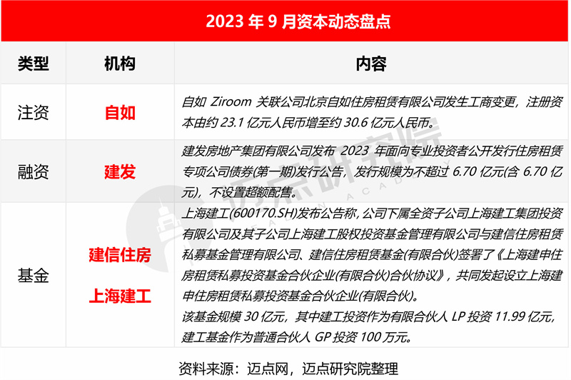 注资方面,北京自如住房租赁有限公司注册资本由约23.1亿元人民币增至约30.6亿元人民币。融资方面,建发房地产集团有限公司发布2023年面向专业投资者公开发行住房租赁专项公司债券(第一期)发行公告,发行规模为不超过6.70亿元。基金方面,建信住房租赁基金与上海建工共同发起设立上海建申住房租赁私募投资基金合伙企业,基金规模30亿元。