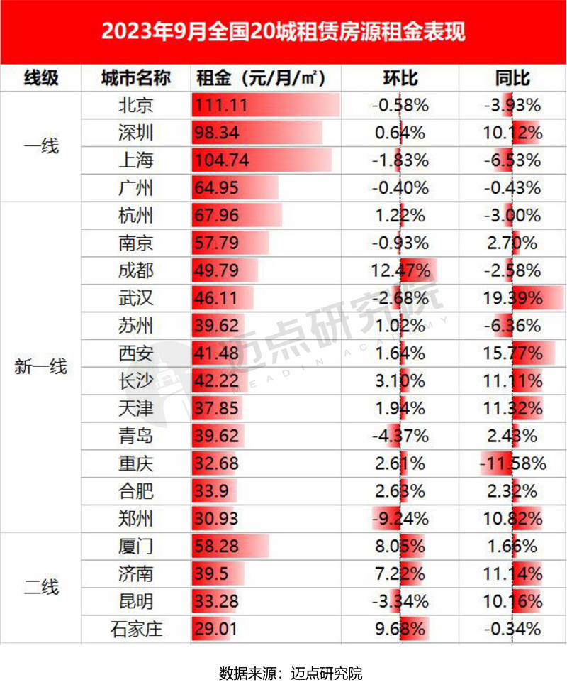 从不同线级城市的租金来看,一线城市租金下降,新一线和二线城市租金上涨。2023年9月,一线城市普通公寓平均租金为94.79元/月/㎡,环比下降0.58%,同比下降0.81%,其中,上海租金为104.74元/月/㎡,环比下降1.83%,同比下降6.53%;新一线城市平均租金为43.33元/月/㎡,环比上涨0.84%,同比上涨3.39%,其中成都租金环比上涨12.47%;二线城市平均租金为40.02元/月/㎡,环比上涨5.55%,同比上涨5.18%,其中,石家庄租金环比上涨9.68%,厦门租金环比上涨8.05%。