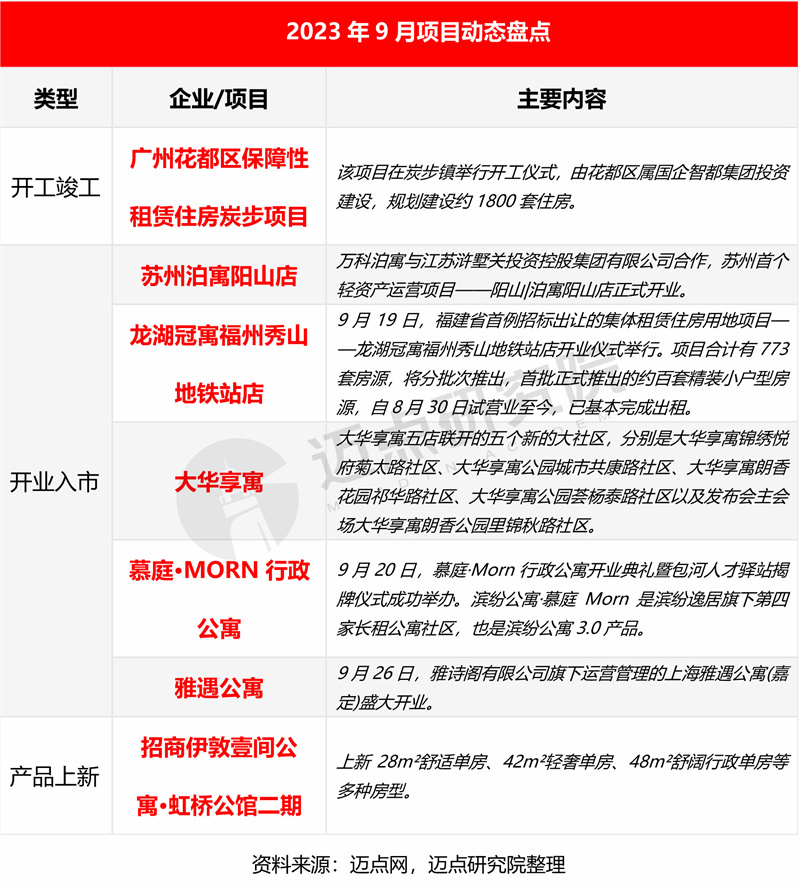 9月,中央对保障性住房项目实施税收优惠政策;地方加强住房租赁资金监管,逐步完善租房补贴政策;多个品牌举办“双节”活动;大华享寓五店联开;上海建工与建信住房租赁基金签署合伙协议;上海、福州、宁波等地保障性租赁住房筹集进度约80%;全国20城住房租赁市场量减价升,租金涨幅收窄。