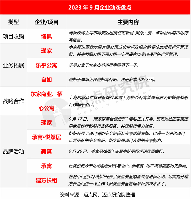 项目收购方面,博枫收购由朗诗寓运营的上海静安区租赁住宅项目。业务拓展方面,瑾家中标玖悦台租赁住房项目运营管理权;乐乎公寓在北京市芍药居商圈落下一子;自如在成都新设自如寓公司。战略合作方面,尔家商业管理有限公司与栖心公寓管理有限公司签署战略合作框架协议。品牌活动方面,承寓和美寓举办“双节”活动;建方长租开展房屋安全排查专题培训活动;瑾家为社区居民提供免费诊疗和健康咨询服务。