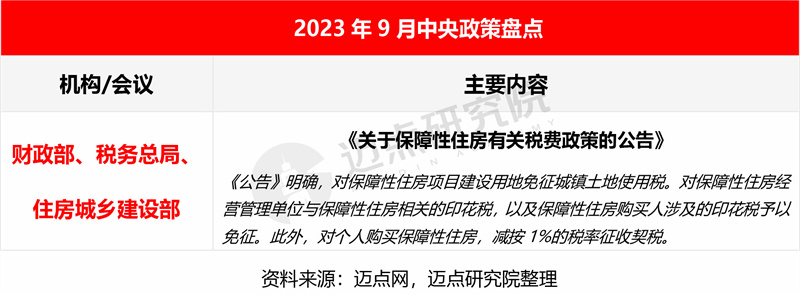9月末,为推进保障性住房建设,财政部、税务总局、住房城乡建设部三部门联合发布《关于保障性住房有关税费政策的公告》,对保障性住房土地供应、项目建设、个人交易等环节相关的税费给予减征免征的优惠,全方位降低成本,提高企业参与积极性,扩大保障性住房供应,加快住房租赁市场发展。