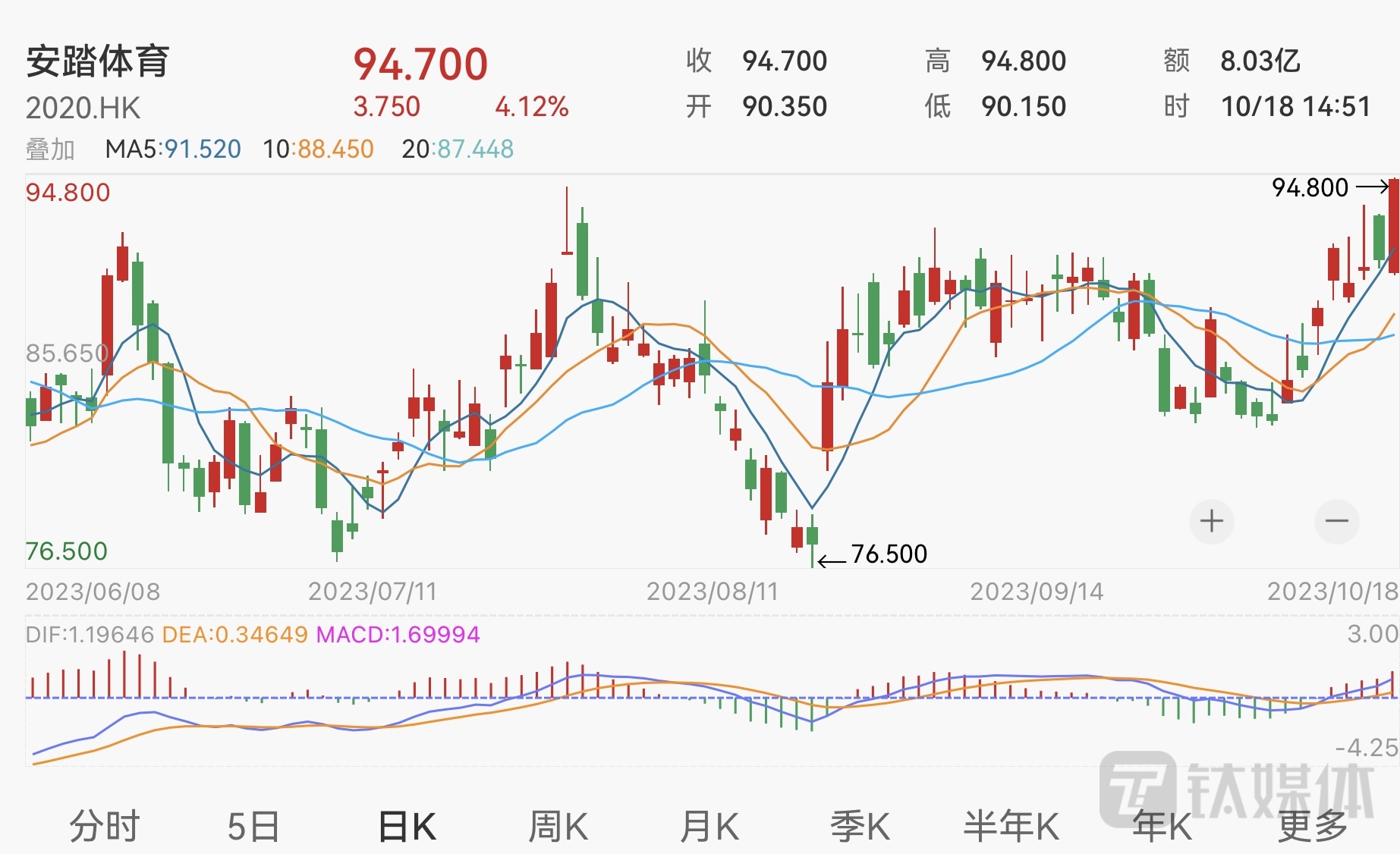 二级市场方面,自官宣上述收购案后,安踏体育股价迎来一波小高峰,10月16日至今已连涨3个交易日,截至发稿前,公司股价报94.7港元,涨4.12%,成交额为8.03亿港元,当前公司总市值约2682.49亿港元。