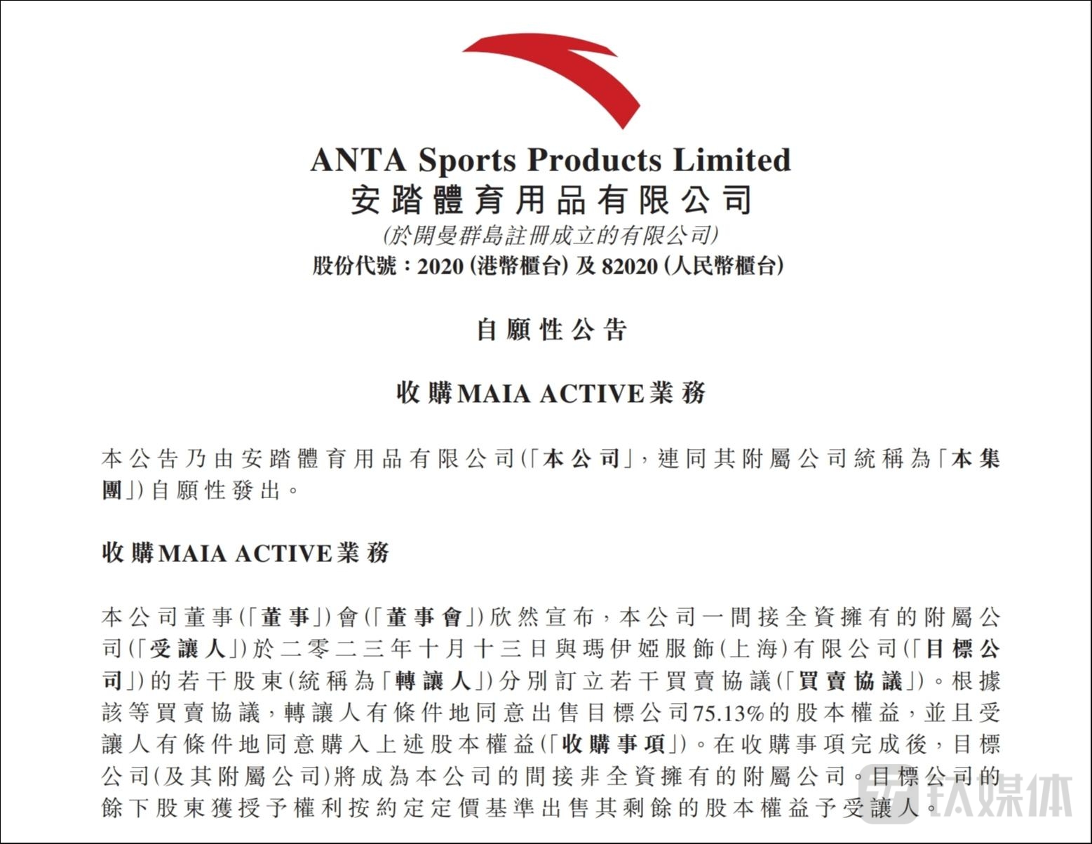继收购斐乐(FILA®)、亚玛芬(AMER SPORTS®)等知名服装品牌后,安踏体育(02020.HK)再有收购新动作,计划买入运动服饰品牌Maia Active®共计75.13%股权。