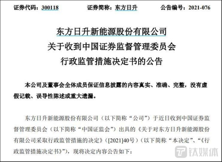 2021年6月,东方日升也收到了来自中国证券监督管理委员会《关于对东方日升新能源股份有限公司采取行政监管措施的决定》。
