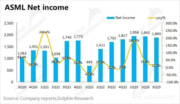 1.4 净利润端:阿斯麦(ASML)在 2023 年第三季度净利润为 18.93 亿欧元,同比增长 11.2%,略超市场预期(18.25 亿欧元)。本季度公司业绩增长主要来自于中国大陆客户拉货大幅提升的带来。