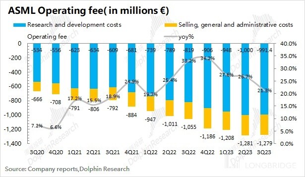 1.3 经营费用端:阿斯麦(ASML)在 2023 年第三季度经营费用为 12.79 亿欧元,同比增长 21.3%。