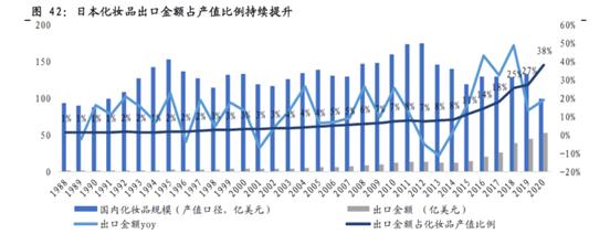 此外,出海成为日本化妆品企业寻求新增量的一致选择。根据国泰君安研究院报告的估算,日本化妆品行业出口金额占化妆品产值比例由90年代的1%逐步提升至2020年的38%,是日本化妆品行业增长的强劲动力。