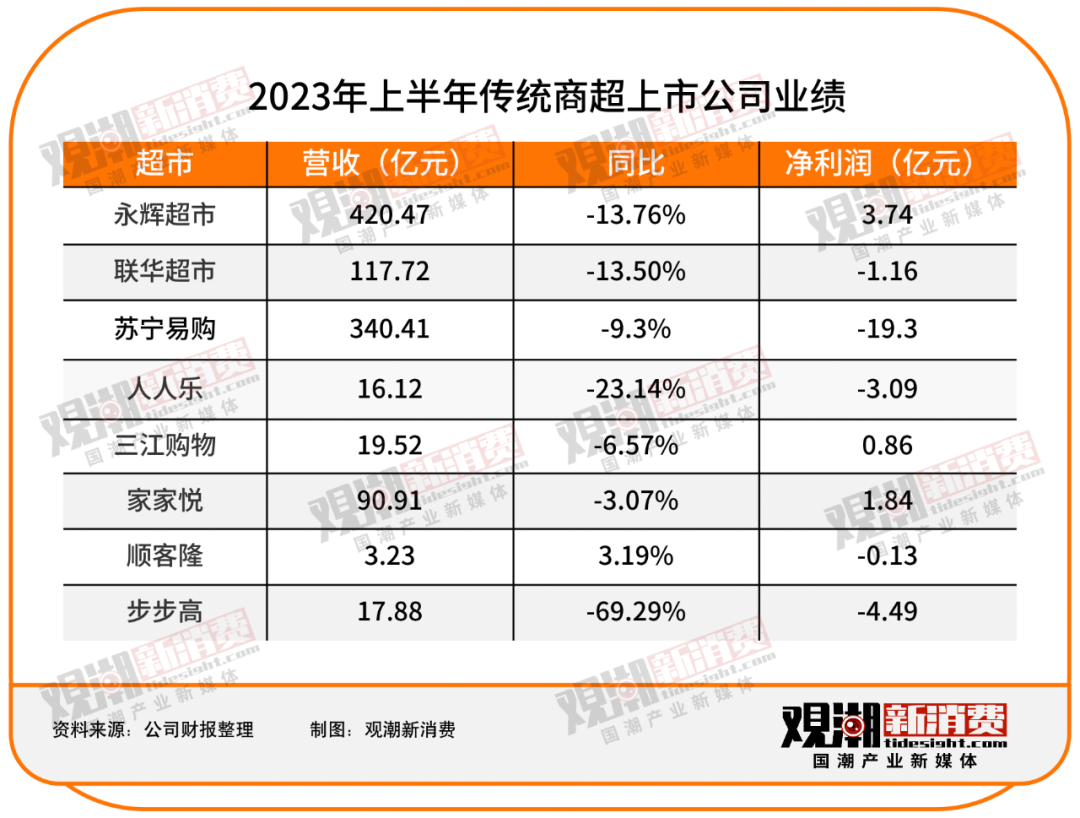 从业绩来看,传统商超今年上半年表现普遍欠佳。永辉超市营收同比下降了13.76%,财报中提到其上半年关闭门店29家;联华超市上半年则出现营收、利润双降,归母净利润为-1.16亿元。同样深陷泥潭的还有湖南本土龙头商超步步高与广东知名商超人人乐,虽然其与国资达成卖身协议,但上半年仍然交出营收、净利双降的答卷。其中,报告期内步步高关闭门店65家,人人乐关闭门店6家。