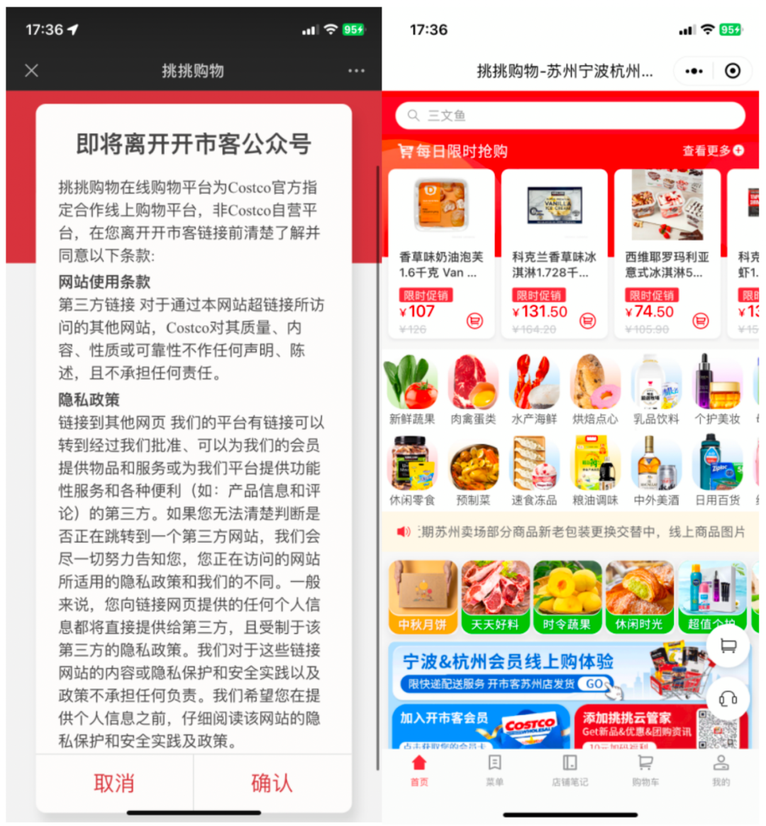 而Costco的线上模式才刚刚开始。目前,Costco选择与第三方服务商——挑挑购物合作,官方的表述是挑挑购物为开市客官方指定的线上商城。而从挑挑购物小程序显示的背景公司来看,小程序挂靠一家叫上海乐丽电子商务服务的公司,有赞则提供技术支持。