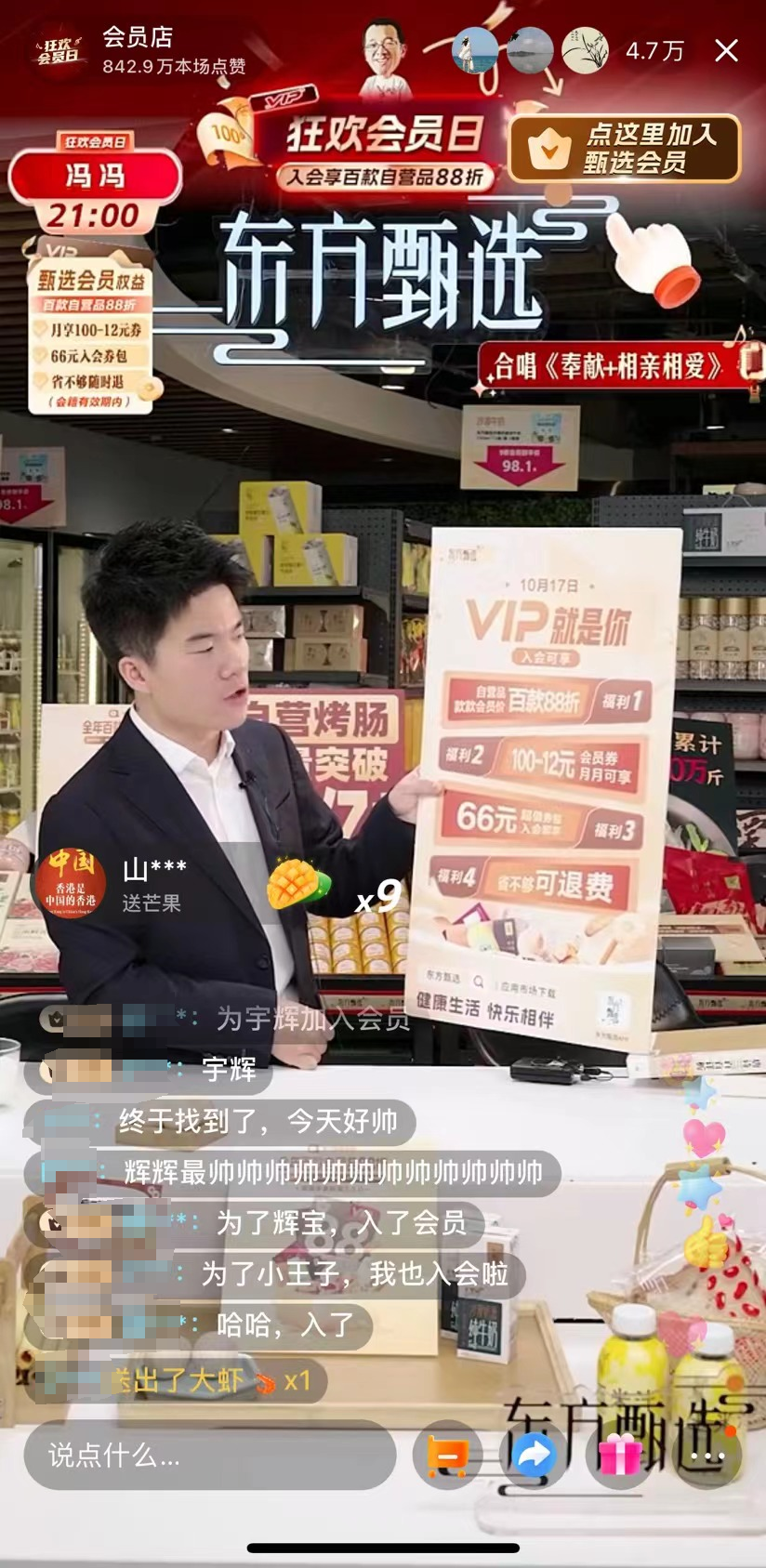 这就很能彰显东方甄选APP的用户构成以及付费会员的潜在受众。当天的直播与其说是带货,不如说是一种变相的“粉丝狂欢节”。付费会员本身和冰箱贴也成了直播间带的“货品”之一,近日的每场直播中,各个主播都会举着牌子反复介绍着VIP权益。