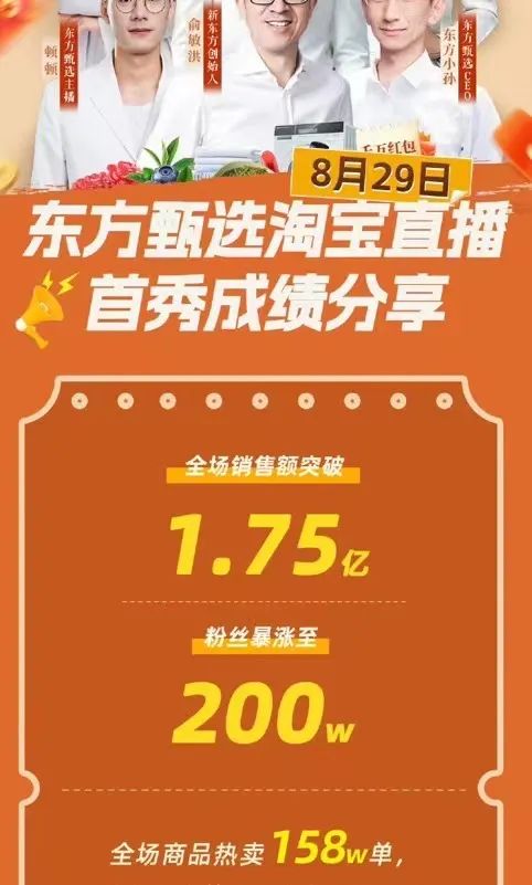 一个月后,8月29日,东方甄选迎来了正式入淘首播,拿下了1.75亿销售额的漂亮战绩,抖音、淘宝、自有APP三个平台共同发展的总体架构初步形成。