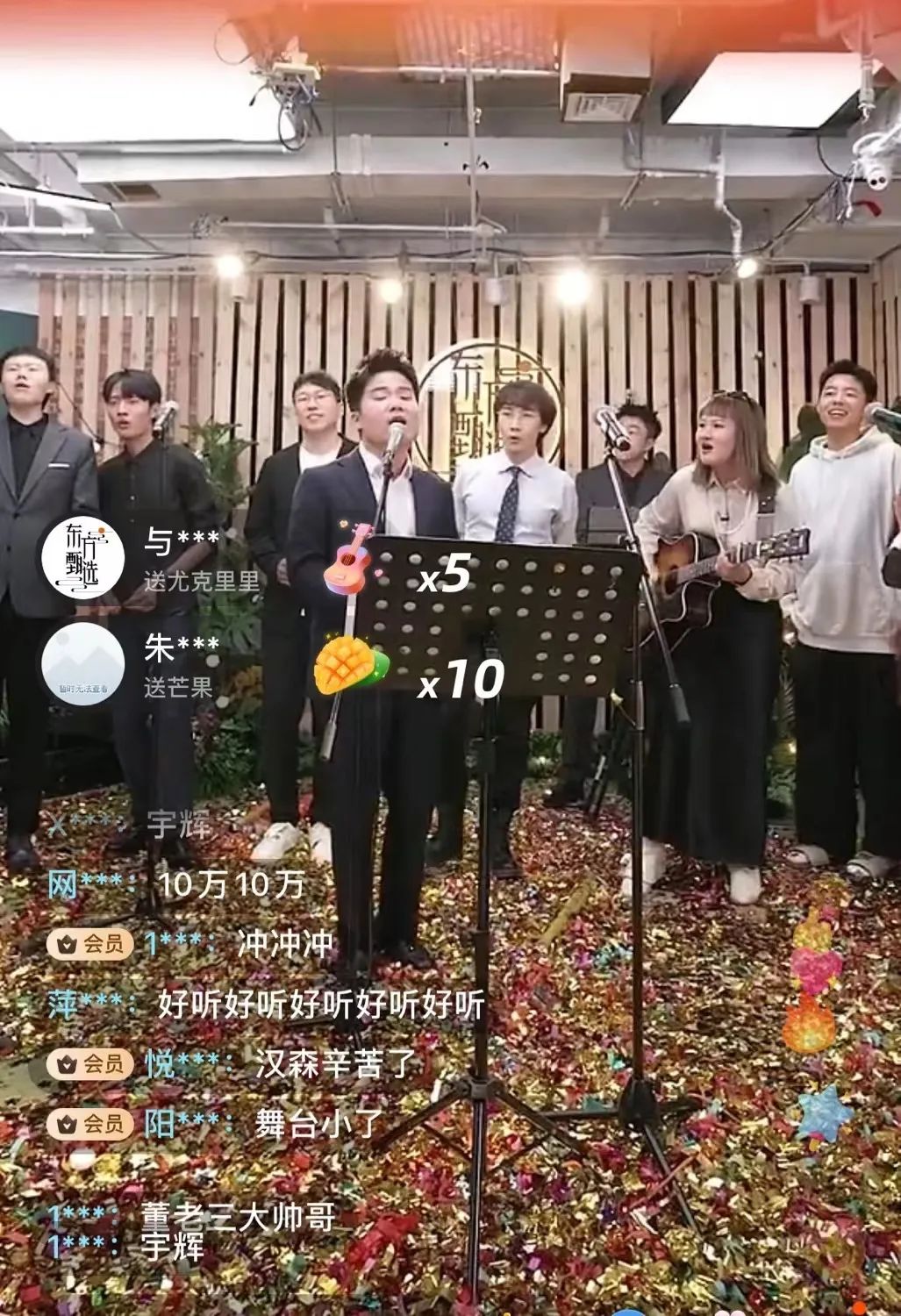 除了带货,东方甄选把直播间变成了年会KTV现场,董宇辉在前,其他主播在后,众星拱月。演唱间隙,董宇辉调侃道,“今天大家花的这199,我们有没有让大家白花啊?我们这可都是全开麦的真唱哦。”